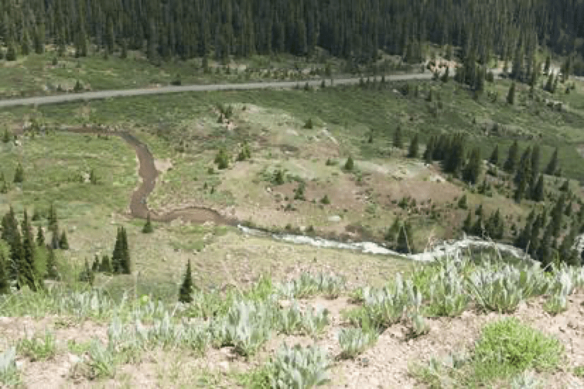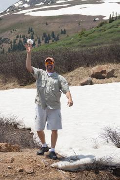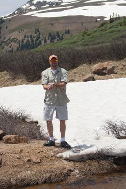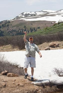 Who doesn’t want to throw a snowball in June? By the time we are on our way down the other side, we’re happy for an excuse to stop at a rest stop and trailhead not only to use the rest rooms, but also to check out the ice cold stream flowing with impressive turbulence just off the trail. Naturally Nate can’t resist and he throws in a line. He catches two cutthroat trout, but both make it off the line before he can reel them in. A disappointment, but then, he hadn’t really expected to catch anything at all at a rest stop.