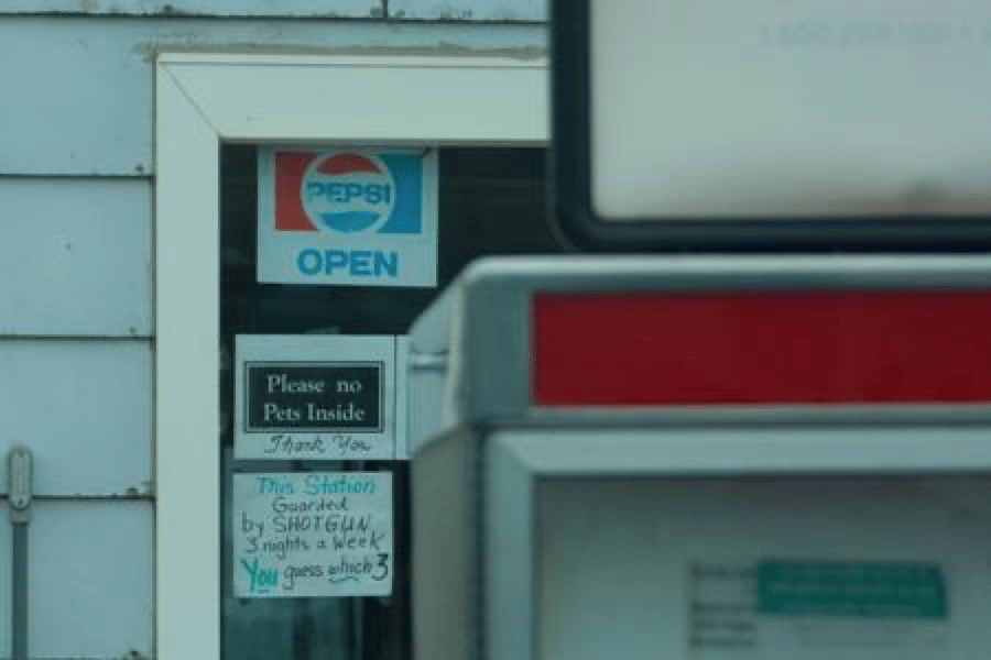 We decide to stop for gas early in the trip, since we’re low and we want to make sure we get a full day of driving as long as we can. What’s this? Oh, gas at the next exit. So, off we go, but there’s no gas station in sight. Instead, we drive two miles down the road to a “town” that wasn’t yet awake. Though the sign in the window proclaims it to be open, it’s quite obvious the gas station is not. And given the other sign they’ve posted, I think I’ll pass on the hospitality offered in this town anyway…