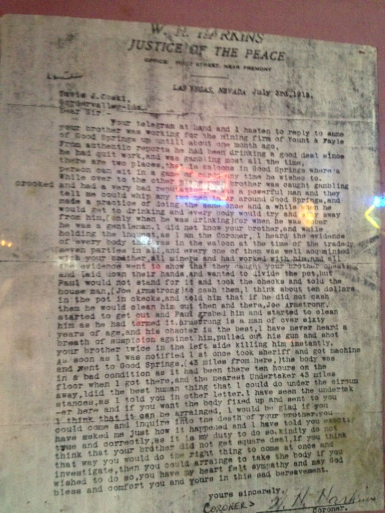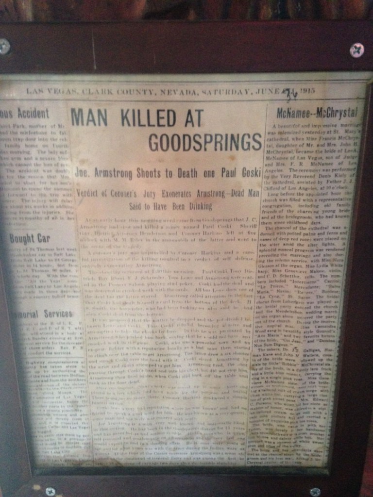 We arrived at The Pioneer Saloon and Ghost Town Cafe in Goodsprings, Nevada, and it looked every bit what you would think. There was a single car out front and Nate made a half-hearted comment as we entered that no one would ever find our bodies. Once seated at the bar in the Ghost Town Cafe, we ordered a delicious, if greasy, breakfast and while we waited, the manager began to chat with us. He asked how we’d heard of the place and we had to confess that we really hadn’t. Signs on the highway had led us in desperation.