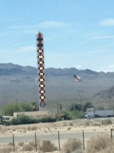 It was 108 degrees when we got back to the highway and I was incredibly relieved that by the end of the day our “Desert Tour” would be fairly well over and we would enjoy the coastal breeze. But both Nate and I started to get a bit nervous when the temp was steadily rising. In fact, the car registered that it was 115 degrees F around the time we passed the world’s largest digital thermometer (why is that even a thing?), reading 111 degrees. And about five minutes after that, Nate noticed the radiator temp was beginning to climb. Enough to make me nervous.