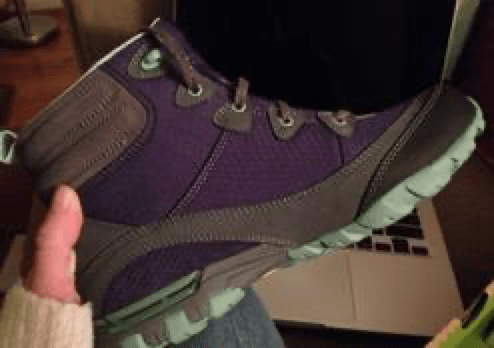 The infamous waterproof purple hiking boots (by Ahnu).  100% worth every penny.  And they are, indeed, waterproof.  I had tested them when I stepped nearly ankle deep in Maroon Lake back in Colorado.