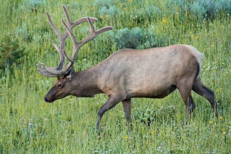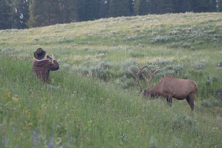 Not knowing exactly where in the campground they were staying, we knew we were taking a chance at driving there, but we figured if nothing else, it was just another trip through Yellowstone to see the sights! We took the gamble and began the trip, but – brake lights – we were quickly stopped in a traffic jam for two gorgeous bull elk! People were out of their cars and some of them were way too close! I, too, was out of the car to get a few shots, but you can bet that I didn’t get this close!