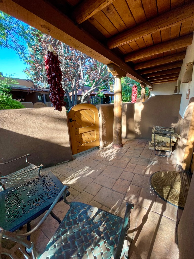 Our room at the inn is lovely and inviting with a fireplace we almost certainly won’t use, and a walled porch with a gate that leads to a courtyard garden that separates the guest rooms from each other.