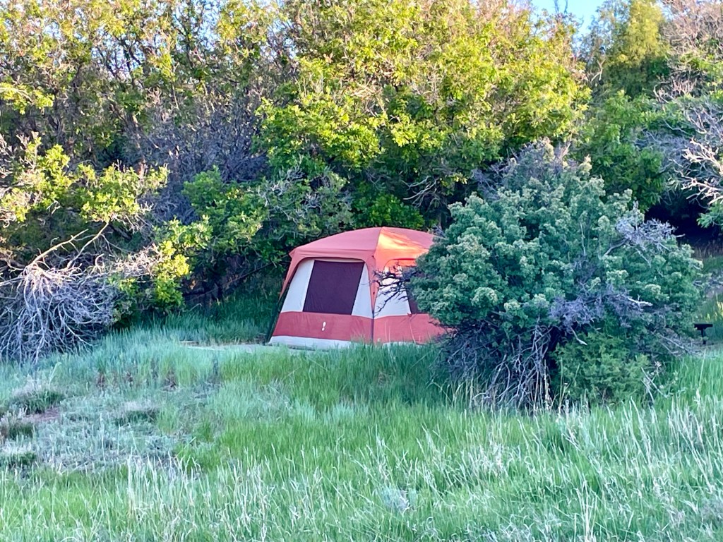 A short time later, we set up camp in a beautiful site with sun and shade and trees. A gust of wind tries to take our tent away before we have it staked down, but we hold on.