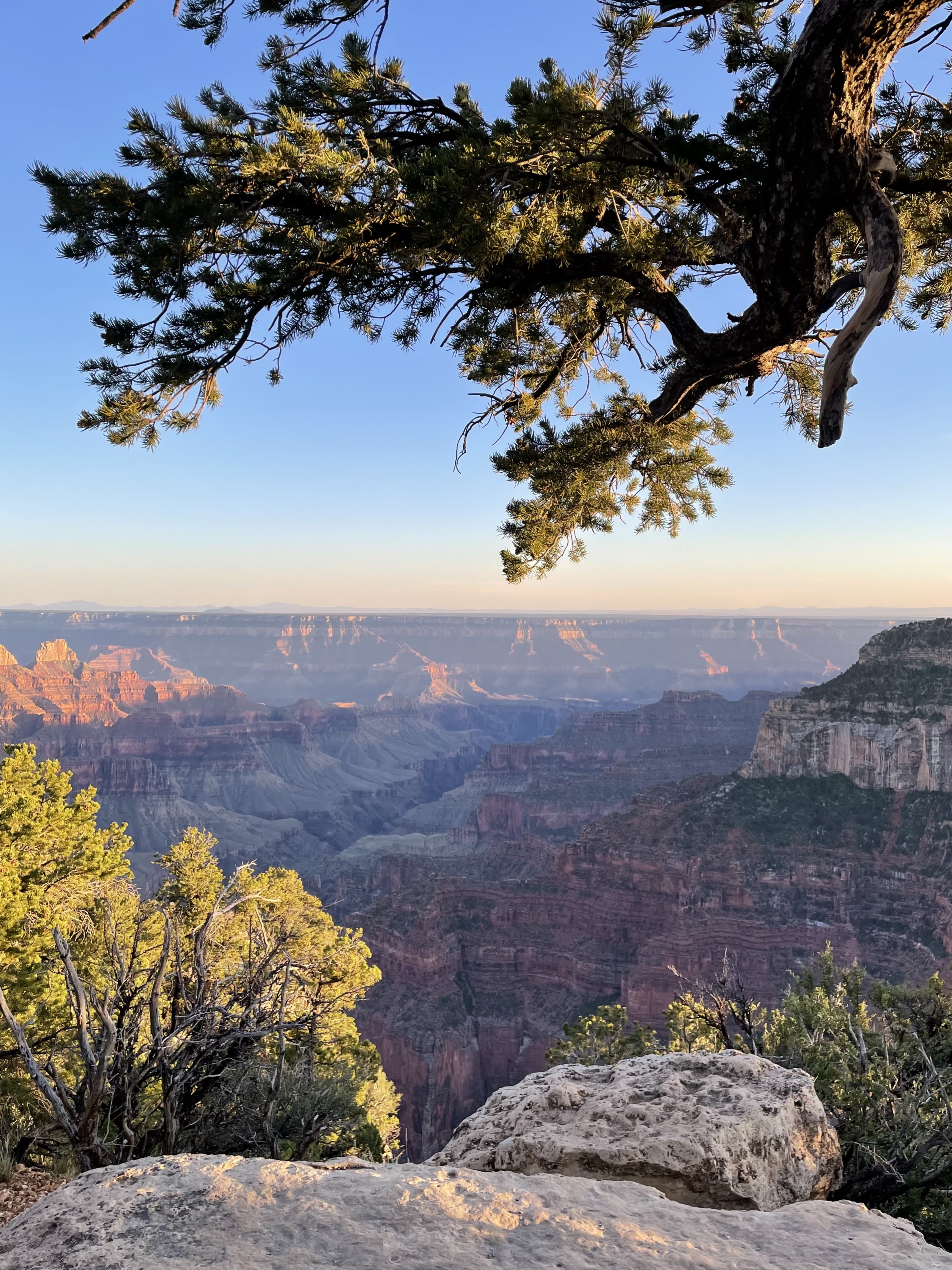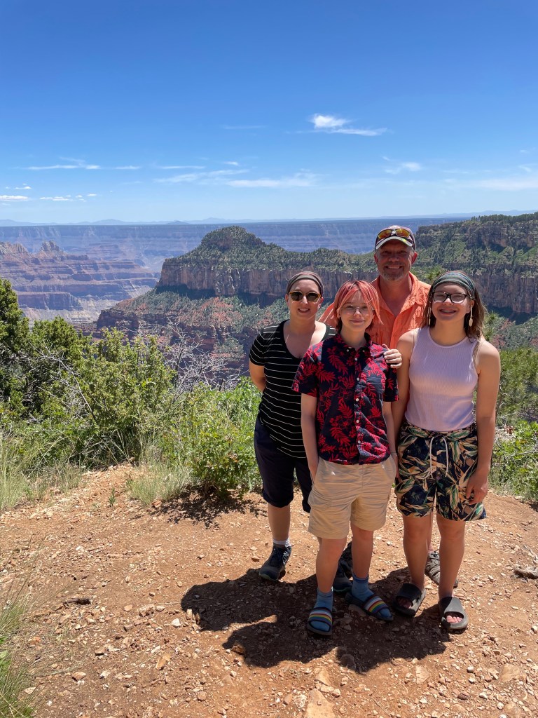 We get to our campsite and set up, but since the tent is in direct sun and will be for hours, we head out to the closest lookout point to take in the view, and get a family photo taken by a French-Canadian from Montreal who just finished hiking 400 miles from Phoenix to the Grand Canyon. My aching joints can’t even comprehend that this is possible.