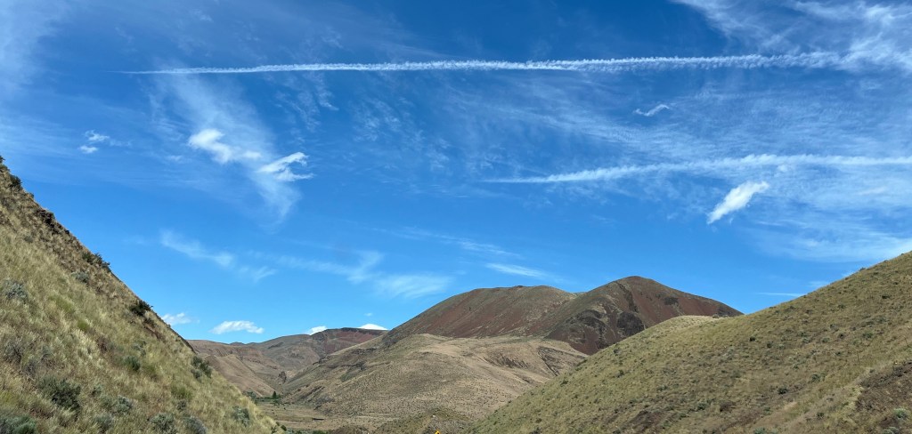 The surroundings quickly change as we drive back into the desert — still Oregon, but no longer woodsy and pine-filled. Sun, scrub brush, and dry hills. But it’s not hot here! It may look a bit like Arizona, but it’s definitely not. Still only 54 degrees at 11 am.