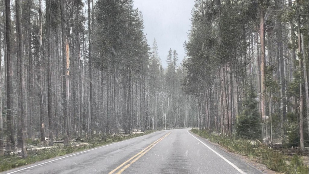 Um, it’s snowing. In mid-June. We’re out the door by 8 am and the cloud cover above us is thick. But snow? I guess it *is* 32 degrees, so it’s not unprecedented. But also not exactly expected either. We’re east-coasters. June means warmth.