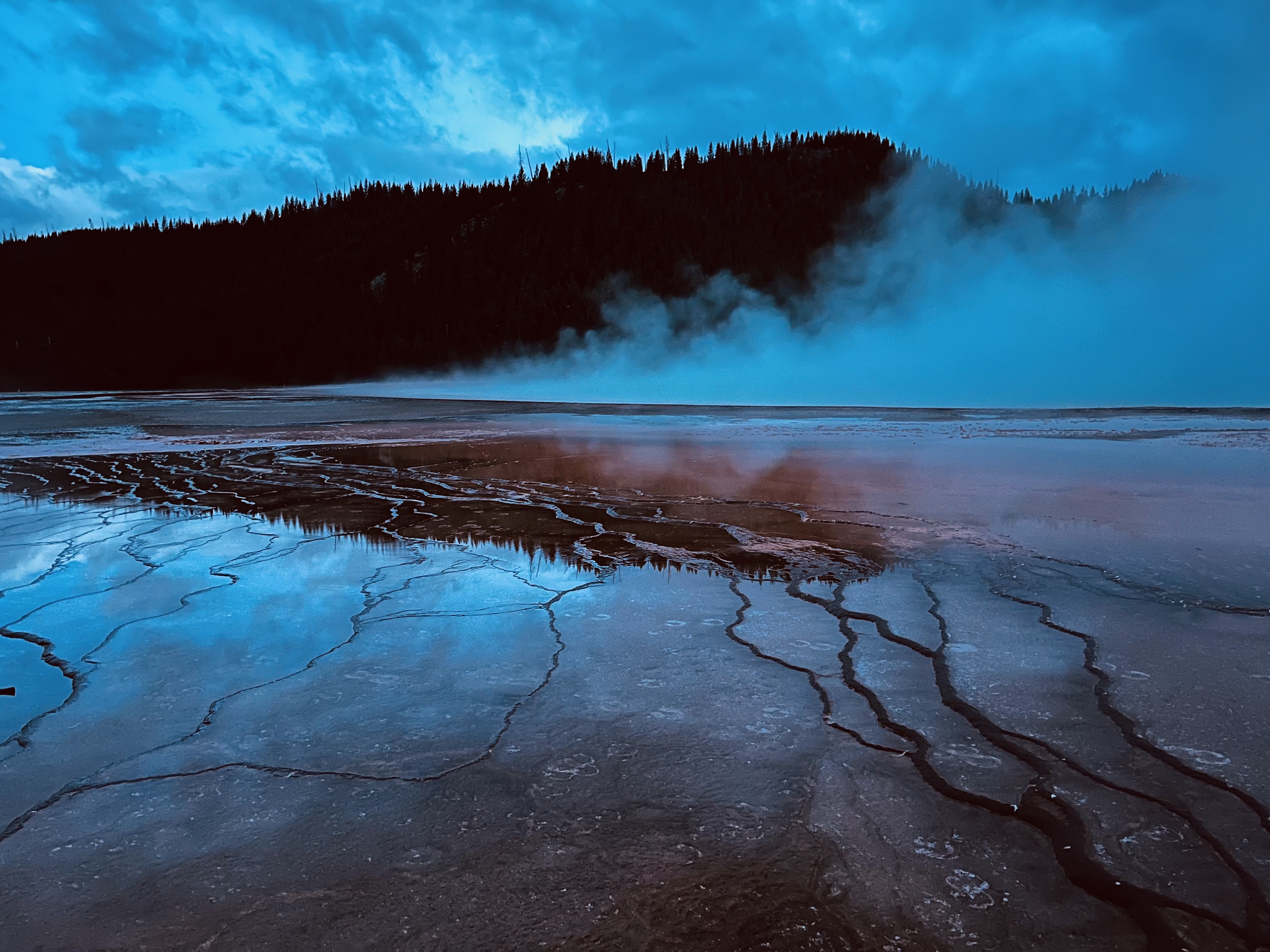 Leaving the geyser, we spot a gorgeous bull elk grazing in the pasture. Do we risk driving a little farther to see if we can catch Grand Prismatic Spring before complete darkness? We do. And we get there after dusk. It’s a long walk on a boardwalk that’s mostly frozen from the steam of the hot springs and the currently 30 degree temps. There’s not much color to see at this point, but with no one here, it’s hauntingly beautiful. (Literally, almost no one. There’s one person here – a girl from Chicago who caught up to us mostly because she didn’t want to be walking it alone, but wanted to see it before she leaves the park.) By the time we return to the car, it’s completely dark and both kids are convinced they’re somehow going to die. And of course…husband finds a ring on the ground in the parking lot, in the dark. Who needs a metal detector? (All these plummeting temps must be making those rings just slide off cold fingers.)