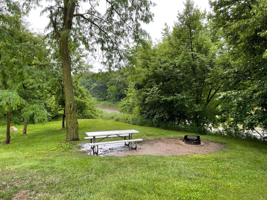 At 11 pm, the Sheriff drives through the park with a message playing on the loudspeaker that severe weather will be developing in the area over the next several hours. What does this mean for us? Is he telling us to leave? Just warning us that it’s going to get sketchy? We don’t know. What I do know is that our little tent site #94 at Palisades State Park ends up with a raging river on two sides of us by 1 am.