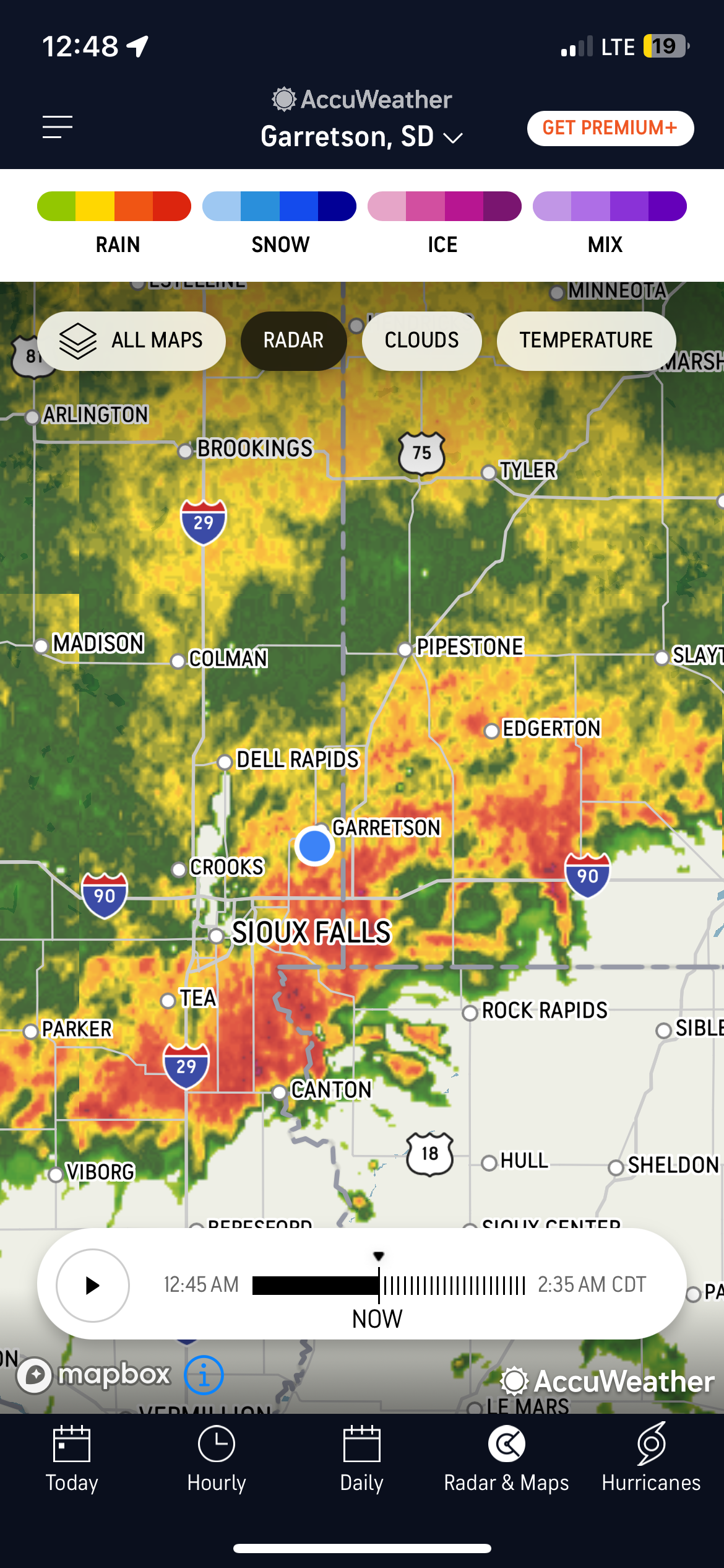 The storm gets so loud and vicious that I can’t fall asleep, despite Husband’s snores being drowned out entirely by the rain on our tent and the rushing water of the creeks. So at 1 am, I check the weather app and see that we’re now in a flood warning, which makes sense since I can hear the small trickle of a creek beside us now rip-roaring and emptying into the larger one. It’s already flooded half the campsite and is still rising. What I can’t understand is how the weather reports could be so wrong all day and into the evening, predicting an end to the rain in “2 hours” no matter what time of day I checked. Regardless of time, the radar always seemed to look like this: